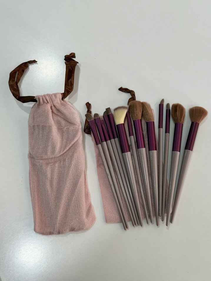 Pastel bej ve mor saplı çeşitli makyaj fırçalarından oluşan set, yumuşak kumaş torba ile birlikte gelir. ️