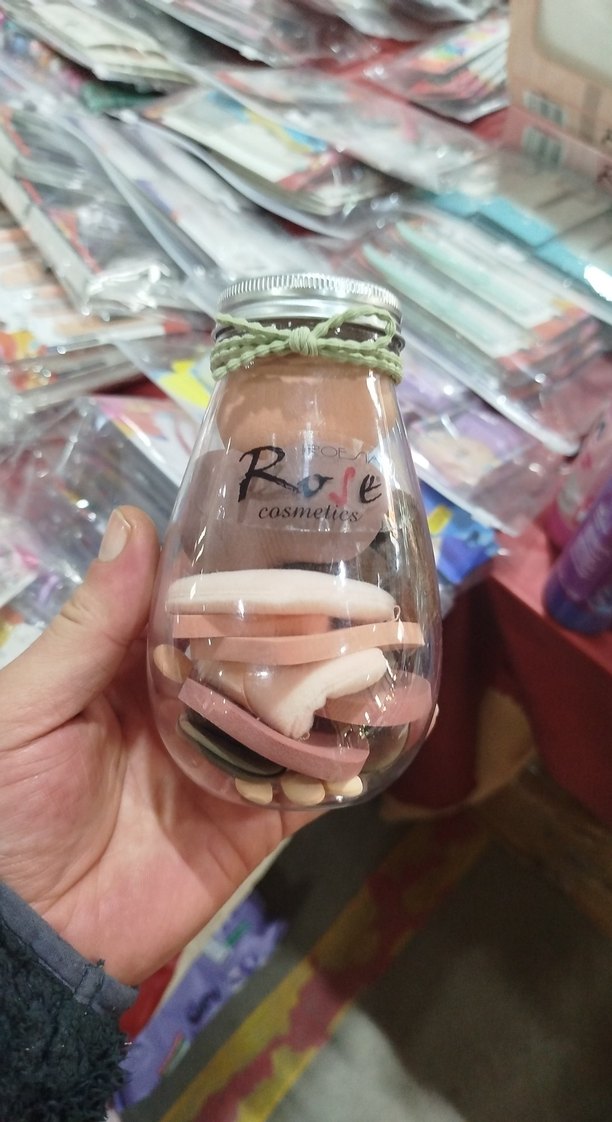 Çeşitli şekillerde pastel bej makyaj süngerleri içeren set, pürüzsüz ve eşit fondöten uygulaması sağlar. Şeffaf şişede saklanır.