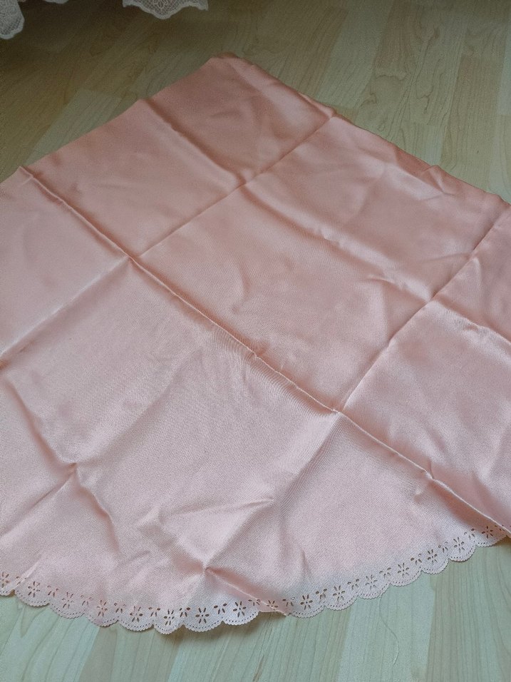 Pastel bej renkte, yumuşak dokulu ve kenarları delikli desenli fırfırlı klasik tarz masa örtüsü. ️