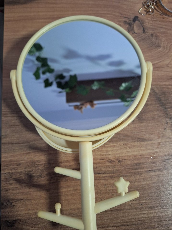 Yuvarlak ayna ve küçük eşyalar için askıları olan pastel bej masaüstü ayna, mekana yumuşak bir dokunuş katar. ÜRÜNDE SARARMALAR MEVCUT GUNES ISIĞINDAN DOLAYI. Temizlik malzemeleriyle cikmiyor. Boyarim ya da sorun etmem derseniz alabilirsiniz.