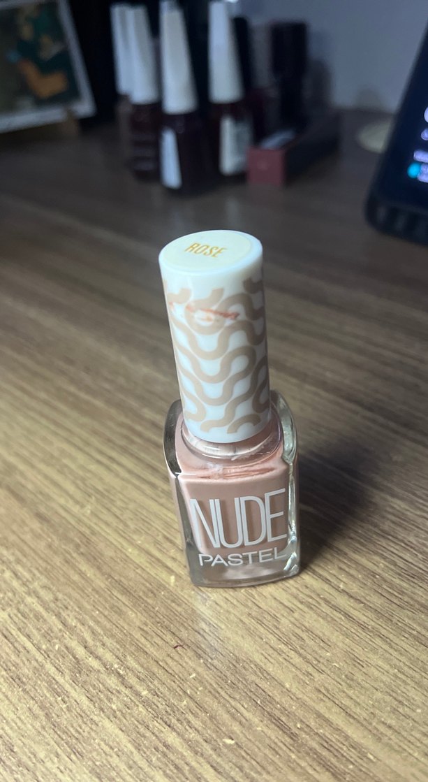 Pastel bej renkte, NUDE PASTEL etiketli, yumuşak bitişli oje. Desenli kapaklı küçük şişede sunulmuştur.