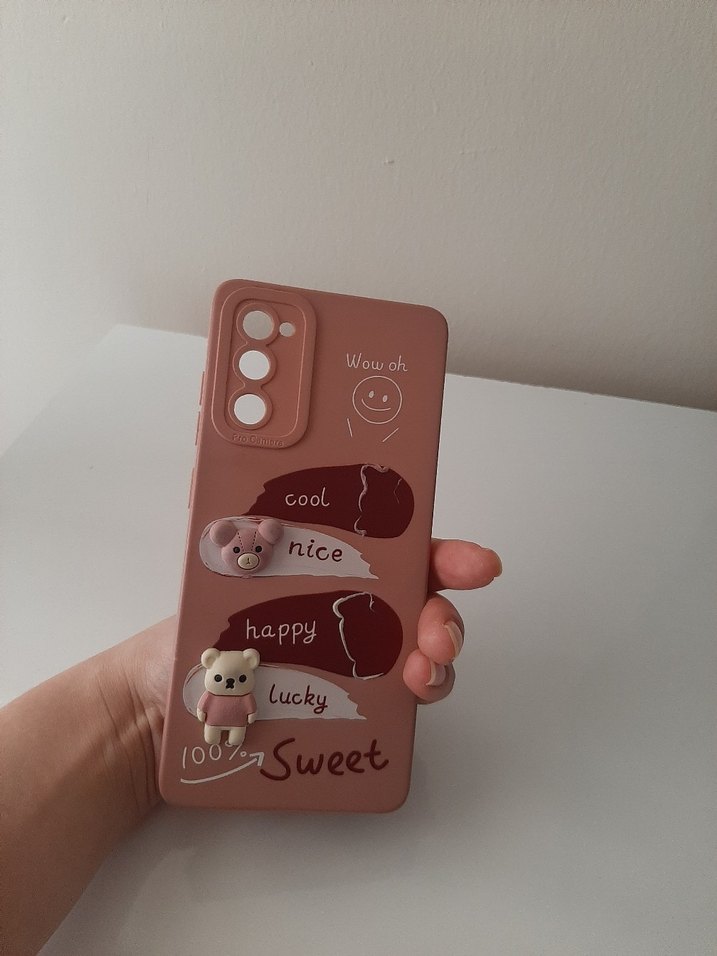 Pastel tonlarda, parlak bej renkte telefon kılıfı. Sevimli ayı figürleri ve pozitif kelimeler içerir. Sokak stili tasarım.