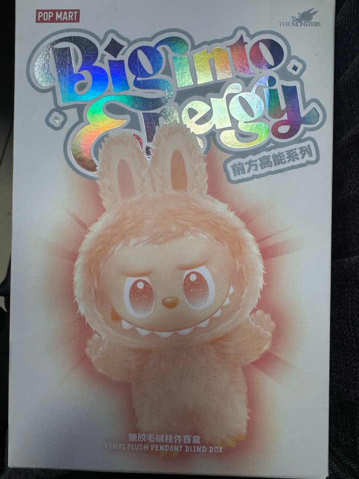 Pastel bej renkte, büyük gözlü ve tavşan kulaklı peluş oyuncak anahtarlık. POP MART'ın kör kutu vinil peluş serisinden.