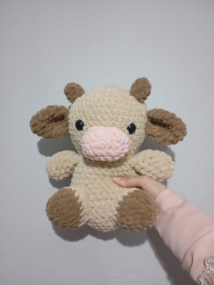Yumuşak pastel bej peluş inek oyuncak, pembe burun ve kahverengi detaylarla, sarılmak için ideal .