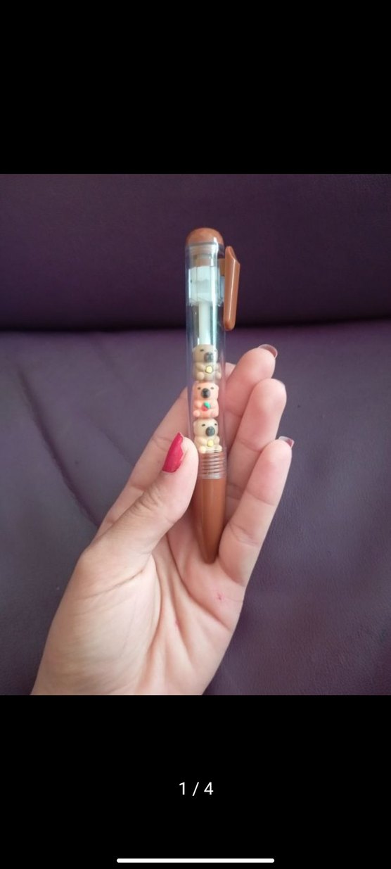 Bej renginde, şeffaf gövdesinde pastel renkli ayıcık figürleri bulunan kalem. Kolay tutuş için klipsli.