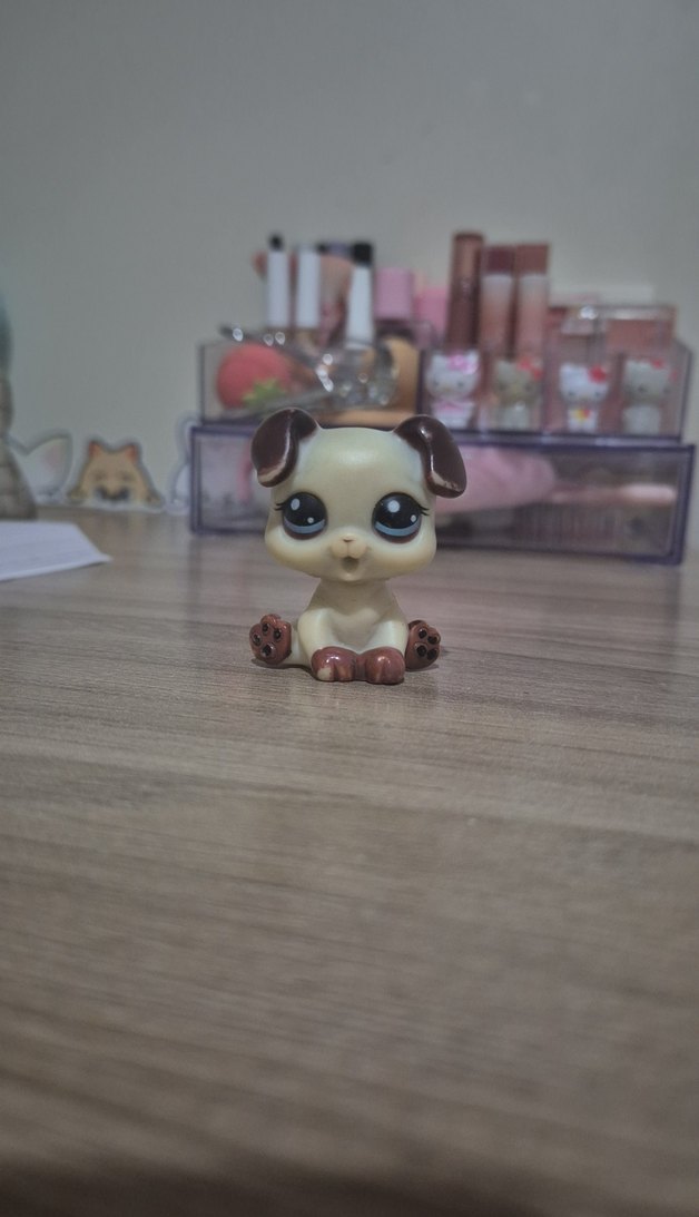 Pastel bej renkte küçük, büyük gözlü, kahverengi kulak ve pati detaylı sevimli köpek figürü.