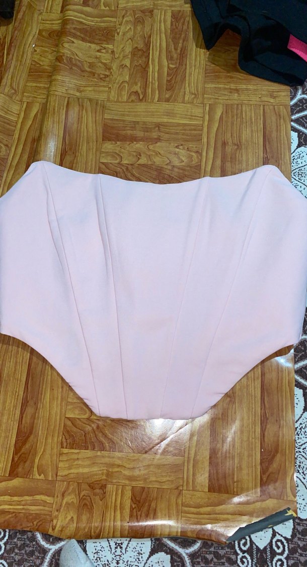 Pastel bej renkli, straplez yakalı ve pilili detaylara sahip, vücuda oturan midi uzunlukta sentetik kumaştan yapılmış çağdaş bir büstiyer.