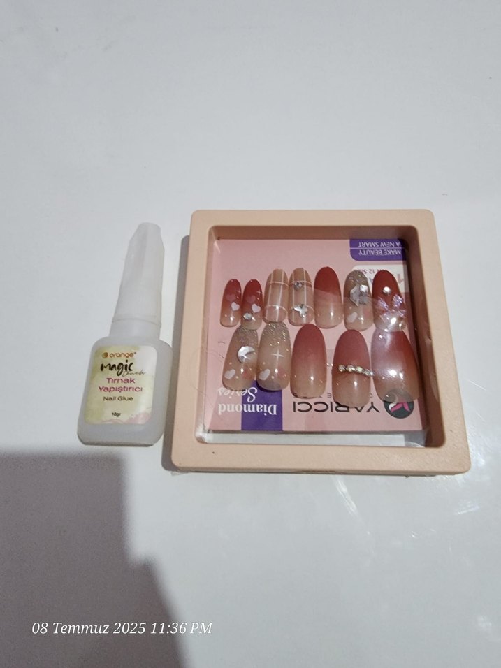 Pastel bej renkte, elmas görünümlü süslemelere sahip takma tırnak seti ve tırnak yapıştırıcısı içerir. Zarif ve yumuşak bir tasarıma sahiptir.