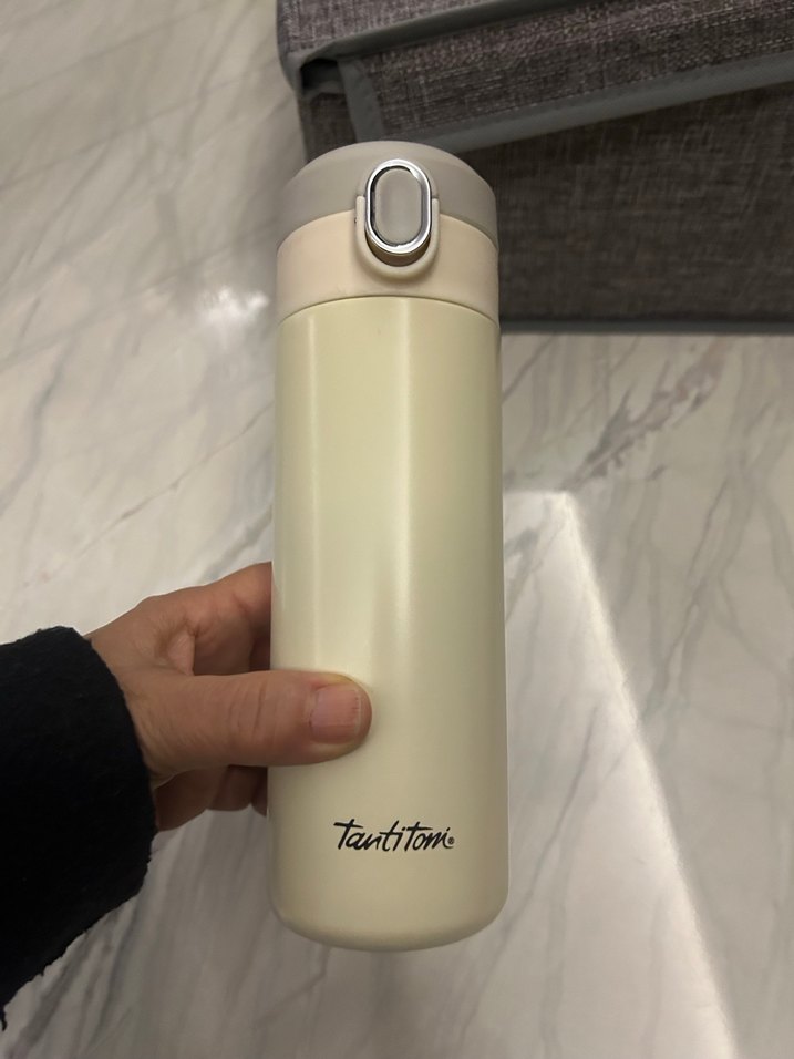 Pastel bej renginde Tantitonic çocuk termosu, güvenli açılır kapak ve pürüzsüz yüzeye sahip, içecekleri sıcak veya soğuk tutar.