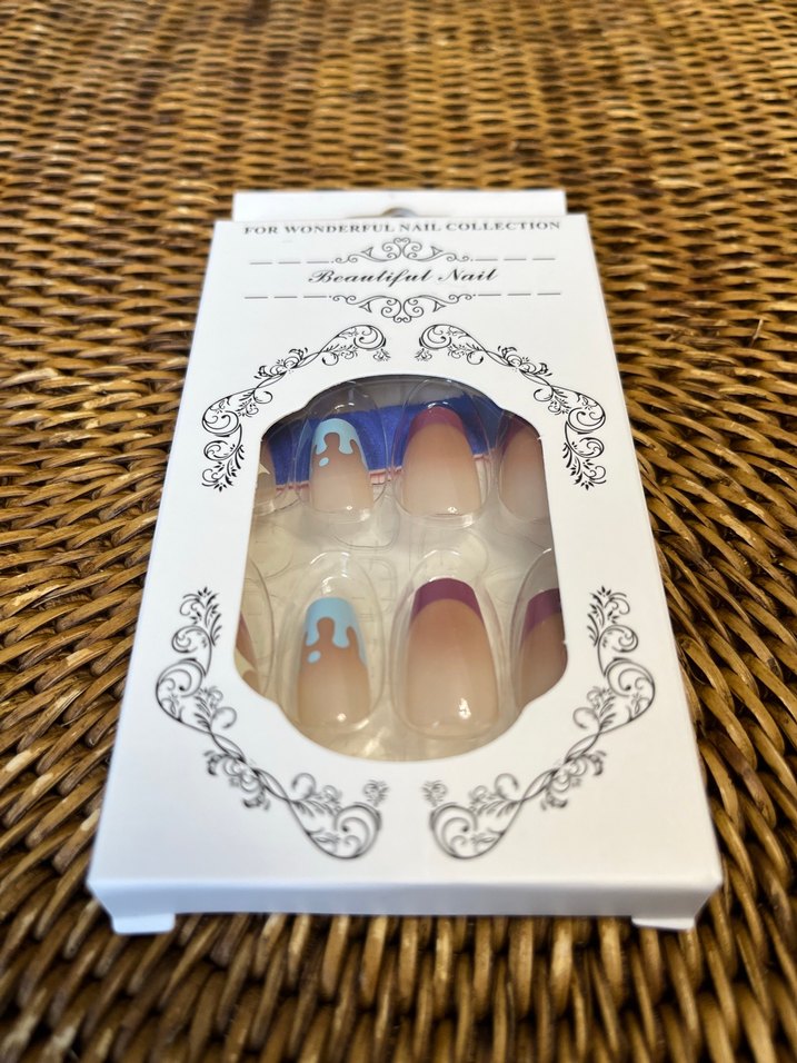 Bej renkli pastel tonlarda, mor uçlu ve mavi damla desenli tırnak süsleri, zarif bir görünüm sağlar. 24 adet tırnak 24 adet yapıştırıcı bir adet törpü
