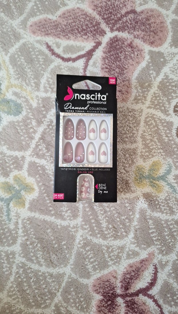 Pastel bej renkte, küçük taşlar ve kalp desenleri bulunan tırnak süsü. Kolay uygulama için yapıştırıcı dahil. 24 parça içerir. hiç kullanılmadı sadece kutusunda yırtık var