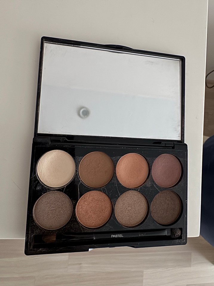 Bej ve koyu tonlarda göz farı paleti, içinde ayna ve çift uçlu aplikatör bulunur. Göründüğü kadar kullanılmıştır, alana şans getirsin♥️