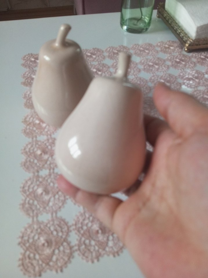 İki adet pastel beyaz seramik armut figürü, dekoratif amaçlı kullanıma uygun, pürüzsüz yüzeyli.