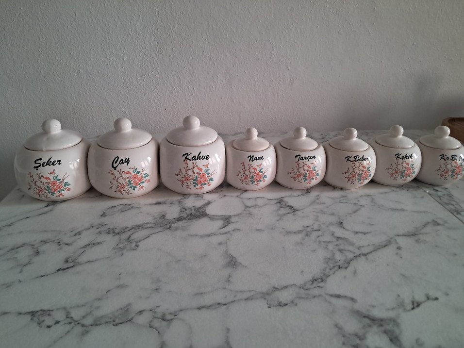 Pastel beyaz seramikten yapılmış, üzerinde çiçek desenleri ve çay, kahve, nane, tarçın, şeker yazılı kavanoz seti. Kapaklı, kolay açılır.