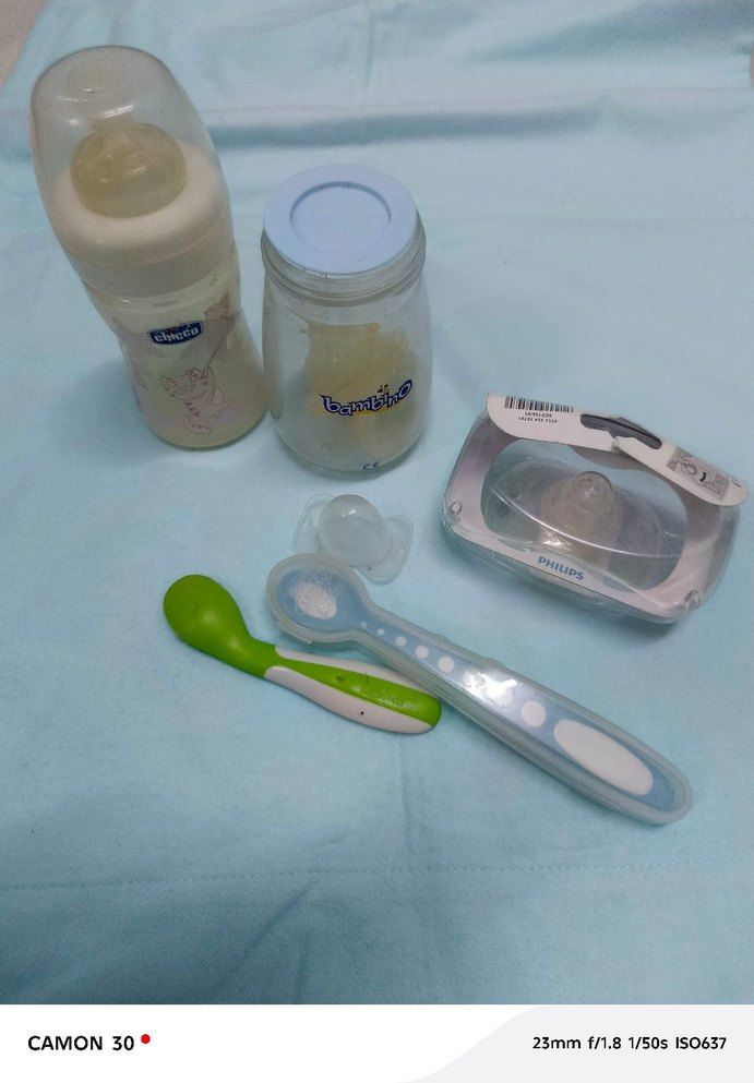 Pastel beyaz renkli Chicco biberon, şeffaf kapaklı kap, yeşil besleme kaşığı, mavi-beyaz bebek kaşığı ve Philips emzik kapağı içerir.
