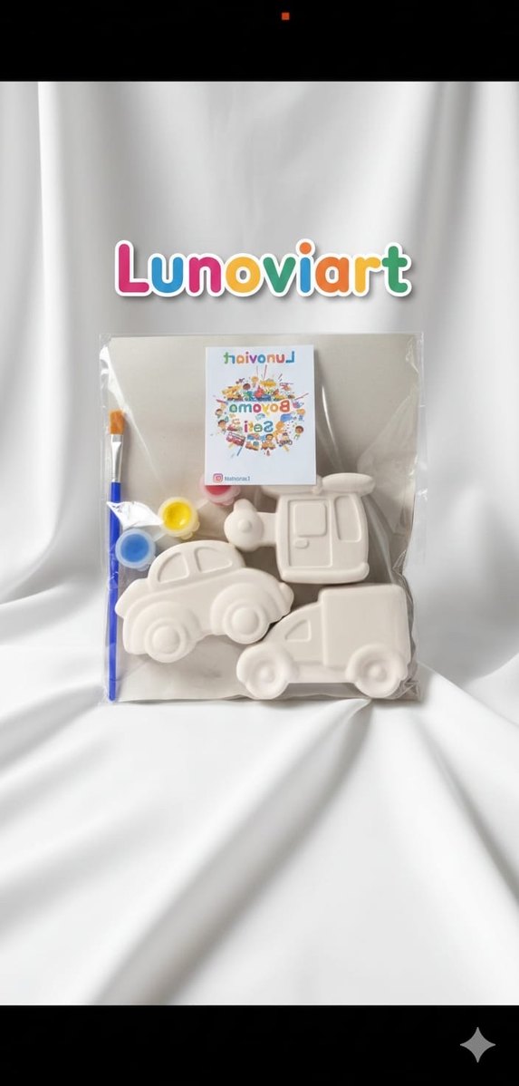 Pürüzsüz malzemeden yapılmış üç beyaz taşıt figürü, boya kapları ve fırça içeren Lunoviart marka boyanabilir set.