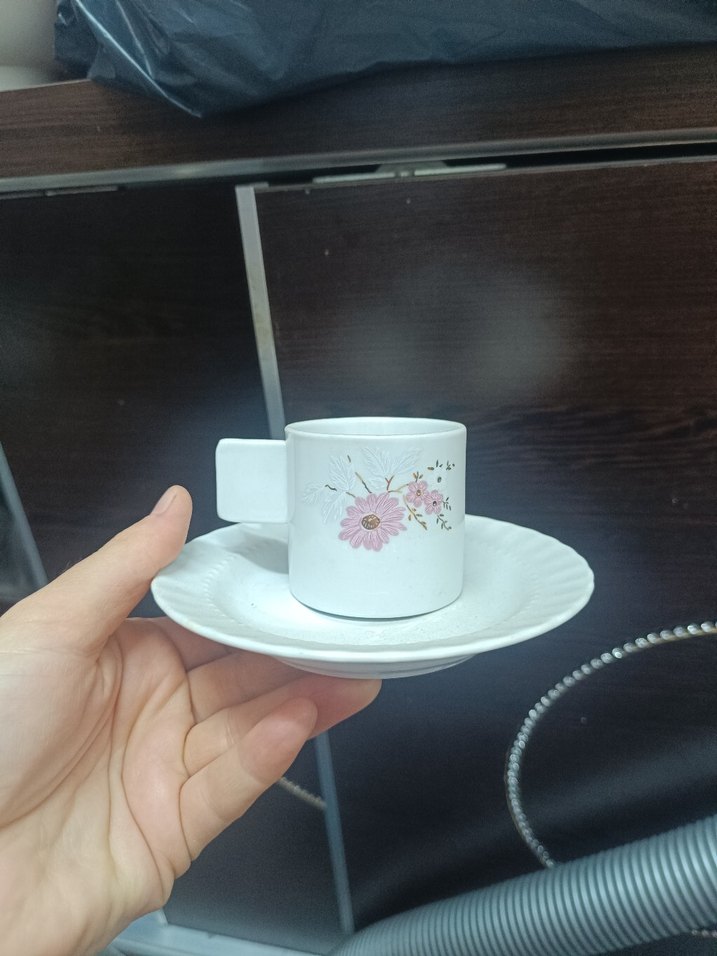Pastel çiçek desenli beyaz seramik fincan ve tabak seti. Fincanın kulpu kare şeklindedir, tabak ise hafif dokuludur. ☕