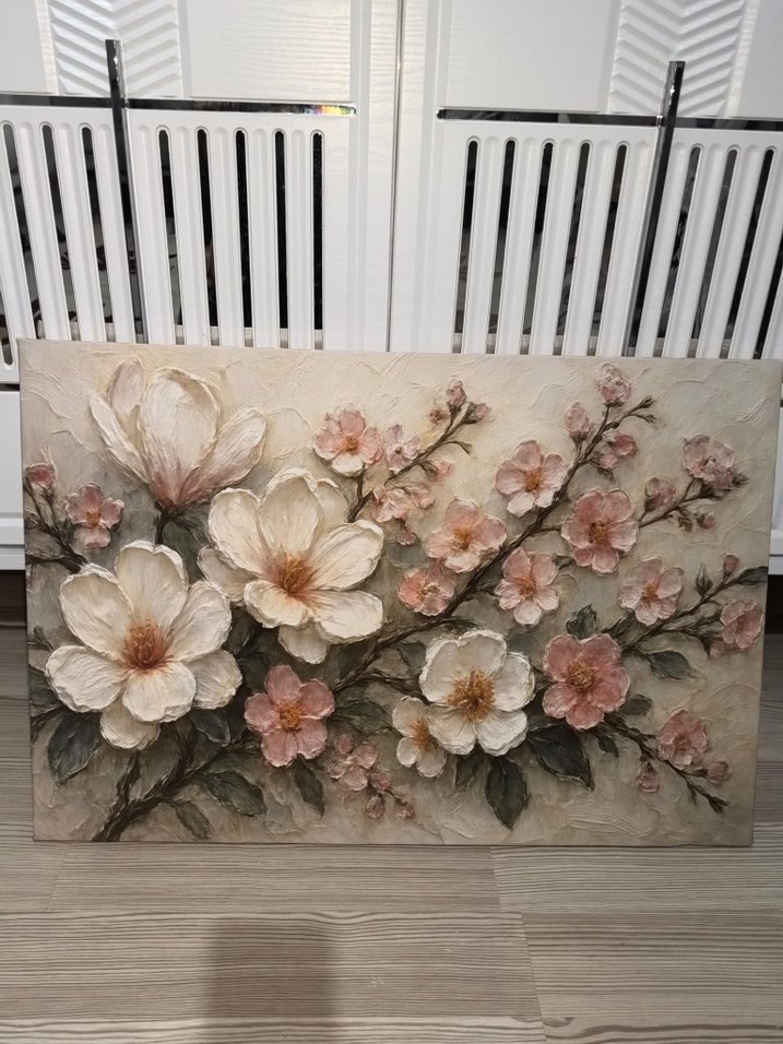 Bu kanvas tablo, pastel beyaz ve yumuşak pembe çiçekler ile yeşil yapraklar içeren zarif bir çiçek tasviridir. Kanvas tablo dijital baskı 50x70 cm güncel stokta var #tablo