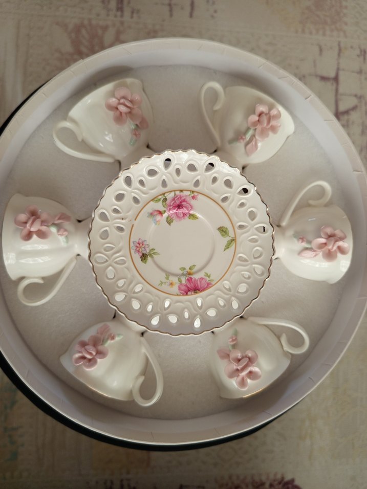 Pastel pembe çiçek süslemeli beyaz porselen fincanlar ve çiçek desenli, ince oyma detaylı tabak içerir.