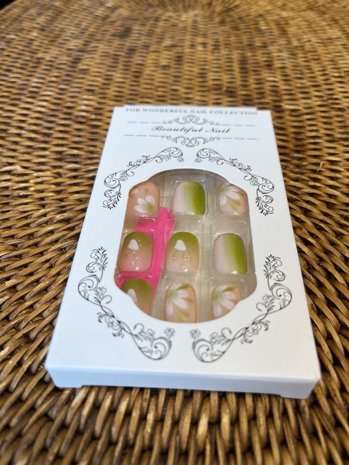 Pastel beyaz ve yeşil tonlarında, çiçek desenli takma tırnak seti. Zarif ve doğal bir görünüm sağlar. 24 adet tırnak 24 adet yapıştırıcı bir adet törpü
