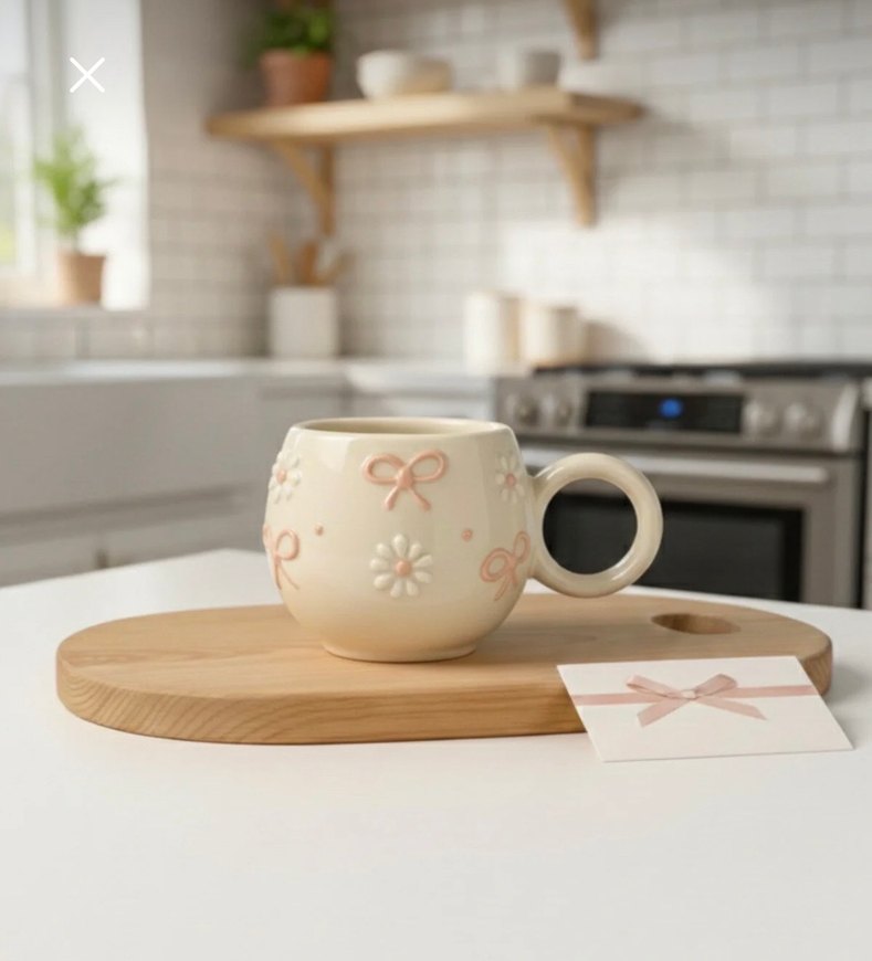 Pastel beyaz renkli, kabartma çiçek ve fiyonk desenlerine sahip seramik kupa. Yuvarlak formu ve geniş kulpu rahat kullanım sağlar. ☕