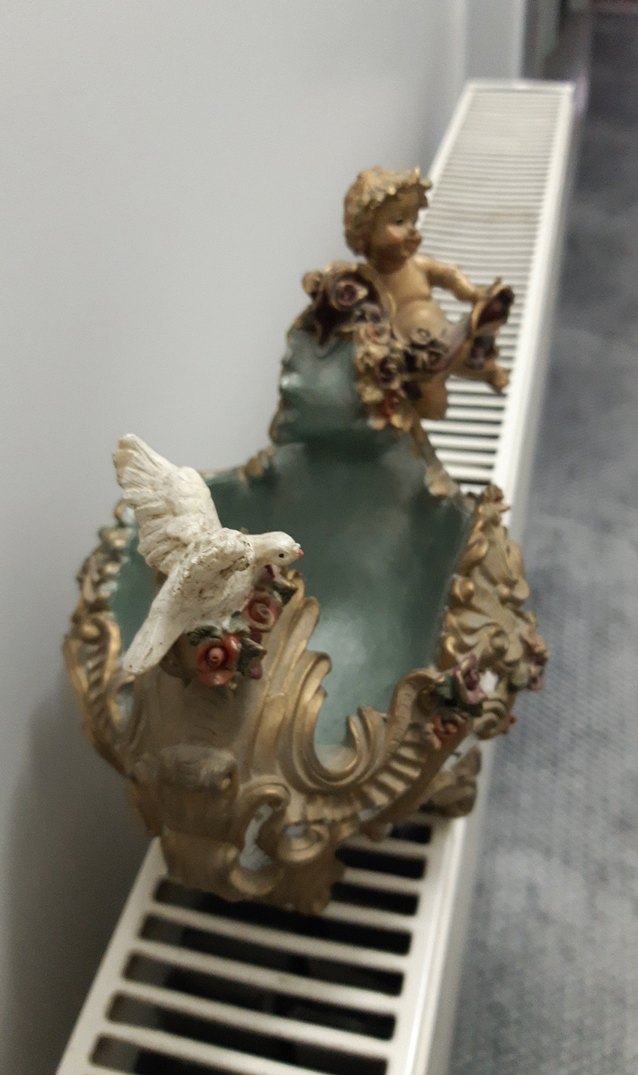 Pastel renkli, beyaz güvercin ve elinde parşömen tutan melek figürlü dekoratif biblo. Detaylı çiçek süslemeleri ve vintage tasarımı bulunur. ️