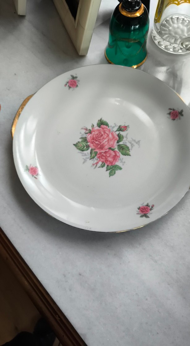 Pastel pembe gül desenleri ve altın detaylı beyaz tabak, pürüzsüz yüzey ve zarif çiçek motifleri içerir.