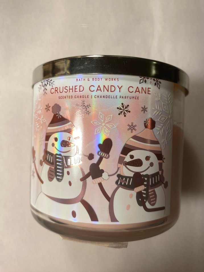 Pastel beyaz renkte, kar temalı etiketli ve kırılmış şeker kamışı kokulu bir mum. Bath & Body Works markasına ait. ❄️ camdan görünen yere kadar yakıldı.