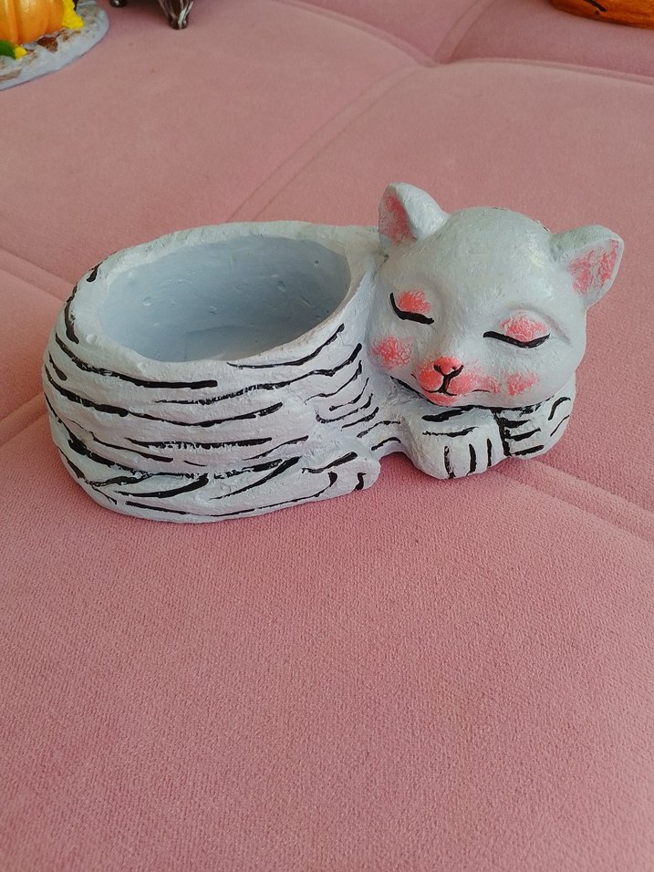 Pastel beyaz renkte, uyuyan kedi figürlü şık kedi kabı. Kedi maması veya suyu için de uygundur.