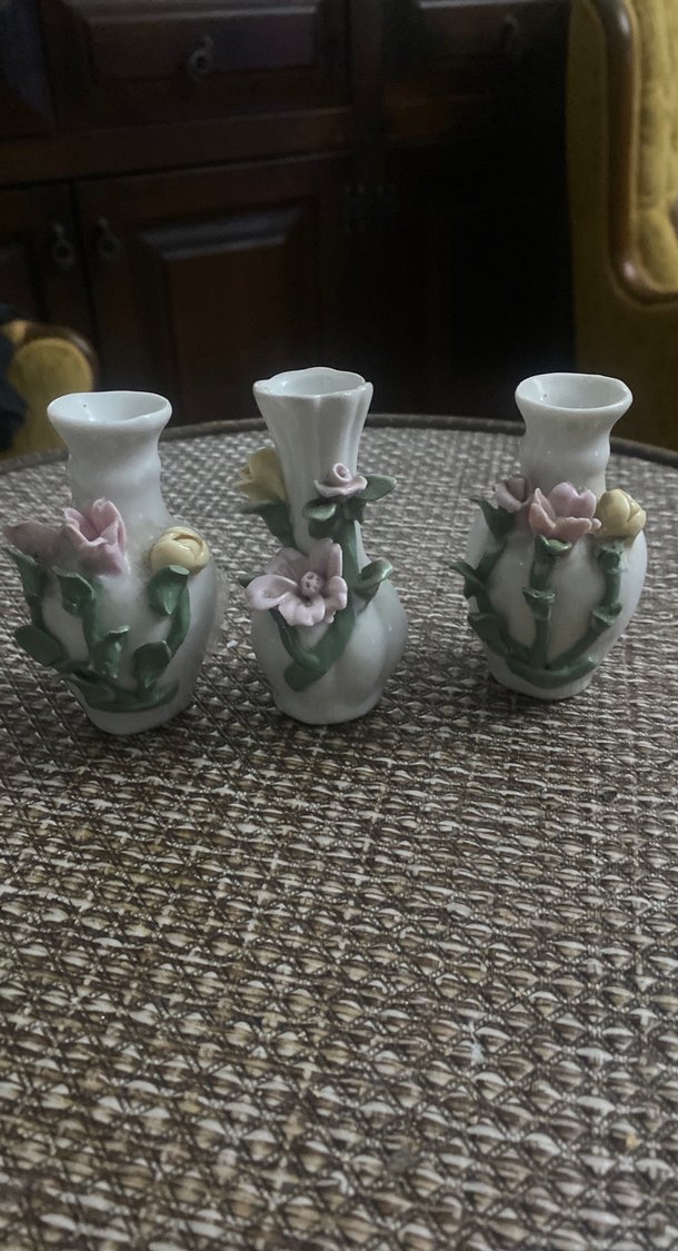 Pastel renklerde çiçek desenleriyle süslenmiş üç küçük beyaz seramik vazo seti.