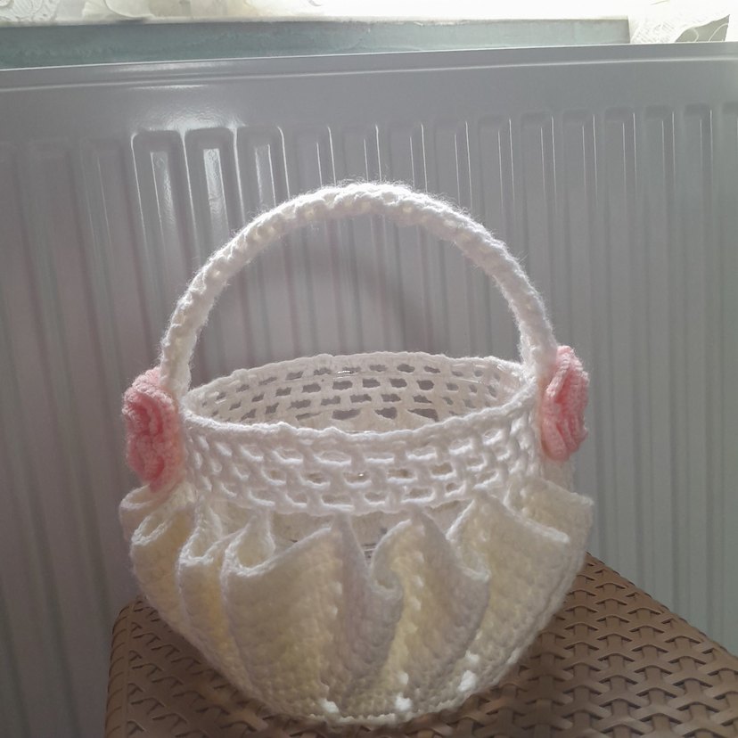 Saplı, yanlarında pembe çiçek süslemeleri bulunan pastel beyaz örgü sepet. Depolama veya dekorasyon için uygundur. Farklı renk çeşitleri isteğe bağlı örülebilir
