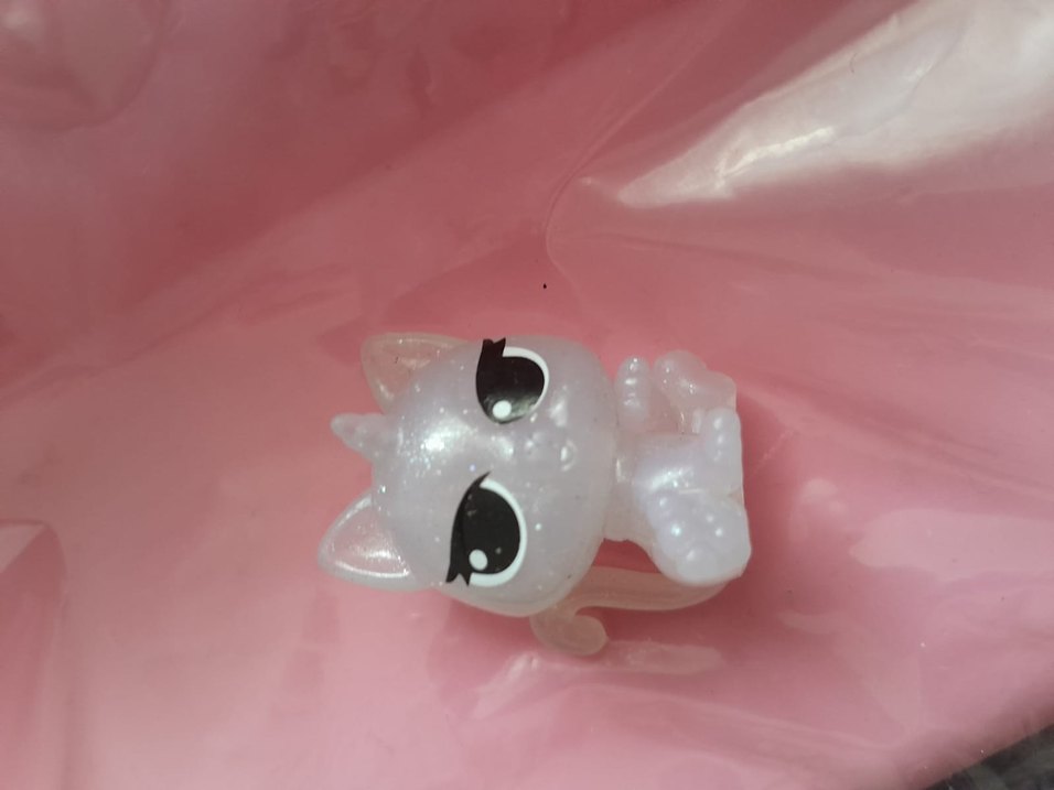 Parlak inci görünümüne sahip pastel beyaz kedi figürü, büyük ifadeli gözleri ve pürüzsüz dokusuyla dikkat çekiyor.