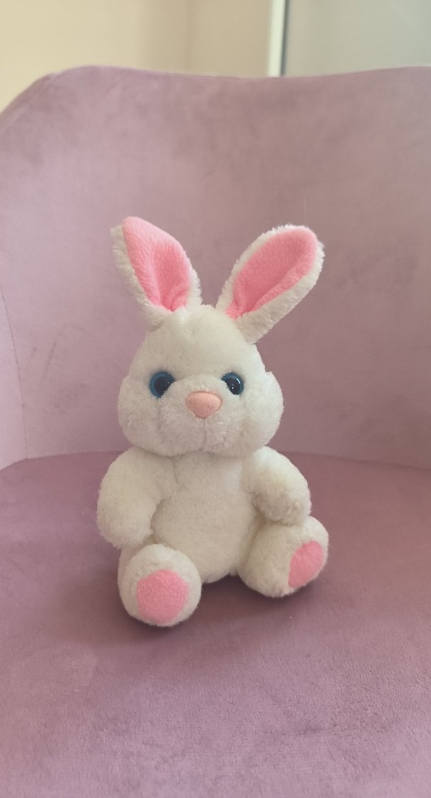 Pastel pembe kulak ve patilere sahip yumuşak beyaz peluş tavşan oyuncak. Mavi gözlü, sevimli ve sarılabilir.