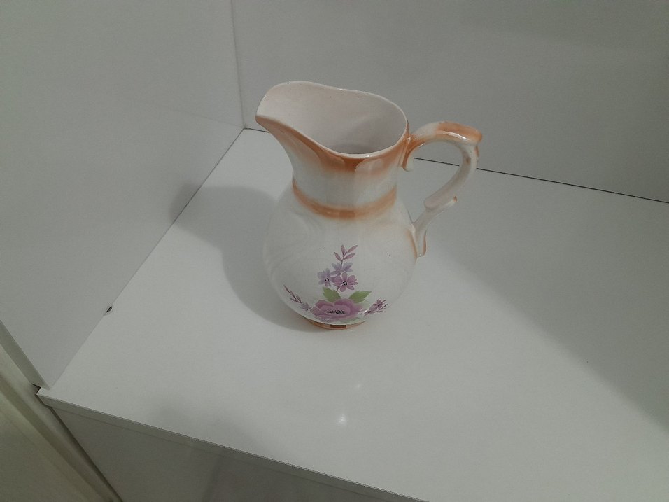 Pastel tonlarda, çiçek desenli beyaz seramik demlik, kıvrımlı kulpu ile çay sunumu için uygundur.