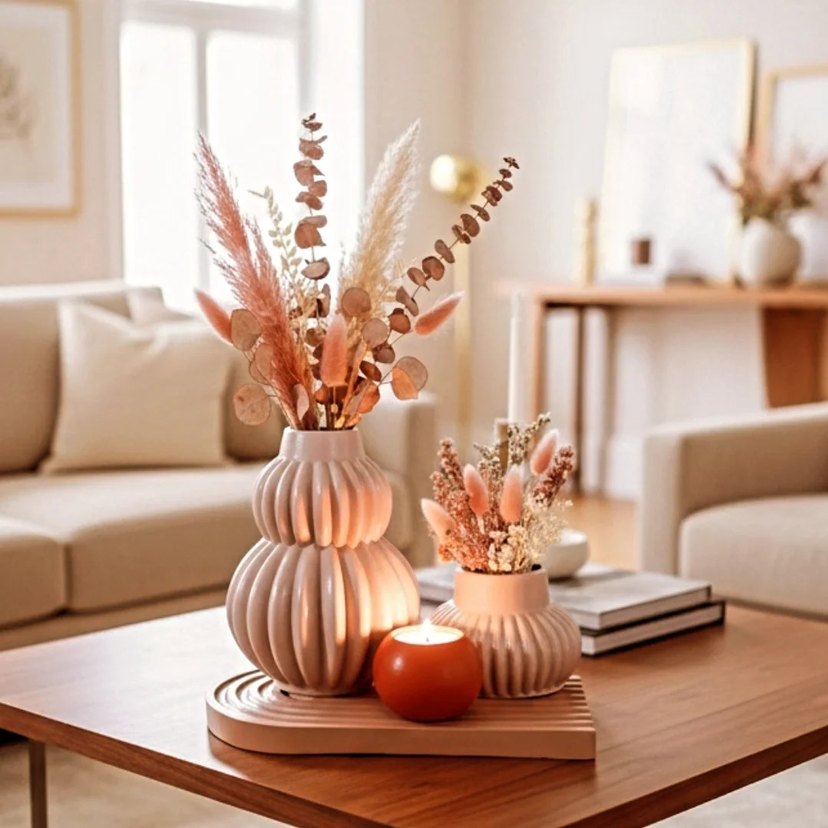 İki adet pastel beyaz seramik, kabartmalı yüzeye sahip vazo seti. Kurutulmuş çiçekler veya dekoratif amaçla kullanılabilir.
