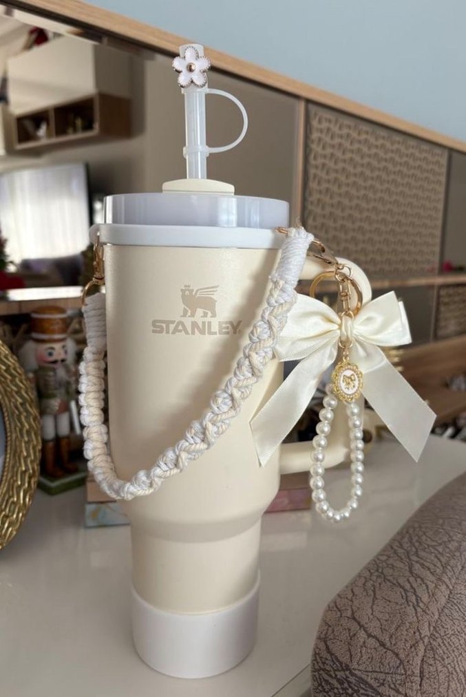 Pastel beyaz renkte Stanley çocuk termosu, örgülü askı, fiyonk ve inci süslemeli detaylarla birlikte gelir. Çiçek şeklinde pipeti vardır.