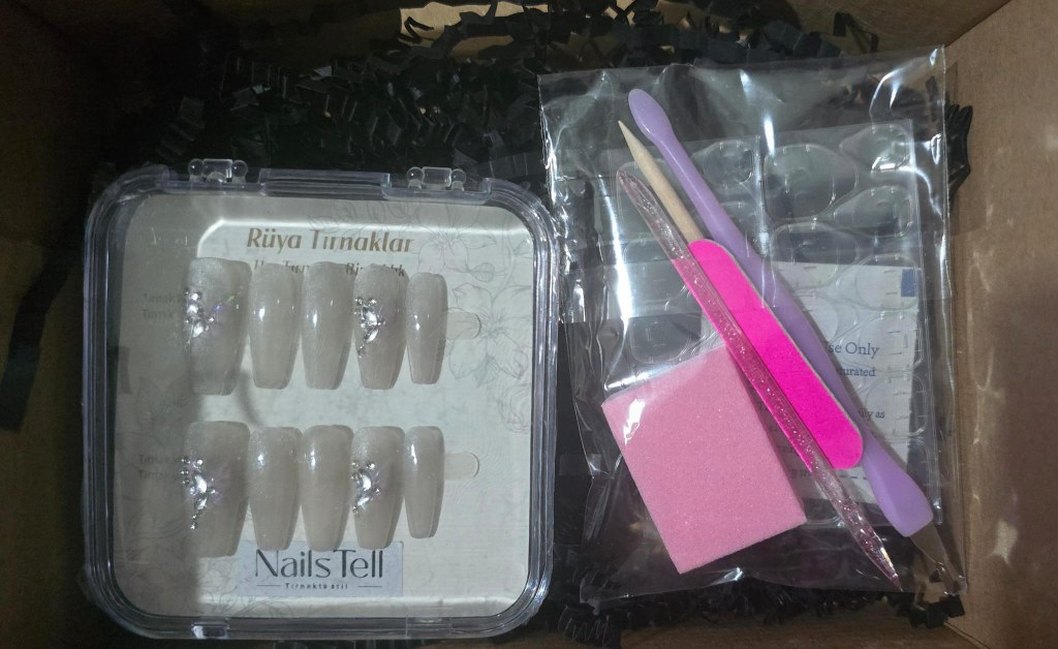 Pastel beyaz takma tırnaklar ve süslemeler ile birlikte tırnak bakım aletleri ve pembe törpü içeren set.
