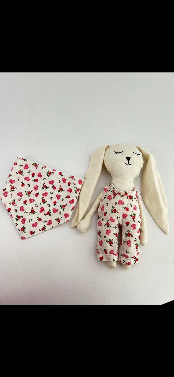 Uzun kulaklı beyaz peluş tavşan, çiçek desenli pastel tulum giymiş ve uyumlu bir kumaş parçası ile birlikte. Ve 1 adet bebe yakalığı..