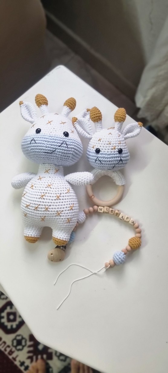 Pastel beyaz renkli, yumuşak örgü dokulu zürafa şeklinde diş kaşıyıcı ve ahşap halka ile kişiselleştirilmiş boncuklu çıngırak seti.