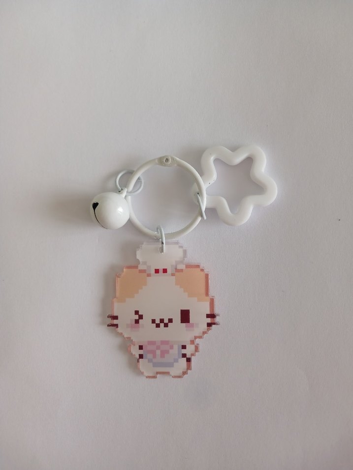 Pastel tonlarda boncuklu, piksel sanatlı kedi figürlü, beyaz zilli ve yıldız şeklinde halkalı minimalist anahtarlık.