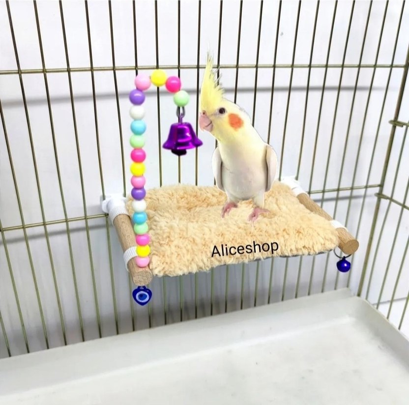 Yumuşak kumaş tabanlı beyaz kuş yatağı, pastel boncuk ve küçük zil ile süslenmiş. muhabbet kuşu ve boyutlarındaki kuşlar için uygundur.