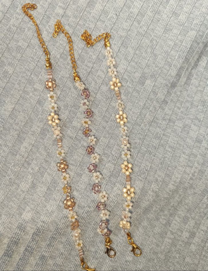 Hediyelik! Altın renkli, pastel çiçek desenli boncuklu el zincirleri. Vintage bohem tarzda, günlük kullanıma uygun.