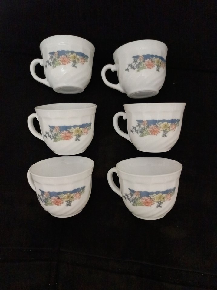 Pastel çiçek desenli, beyaz porselenden yapılmış 6 adet fincan seti. Her bir fincanda rahat tutuş sağlayan sap bulunmaktadır. ☕ Fransa'dan alınmıştır,altında yazılı