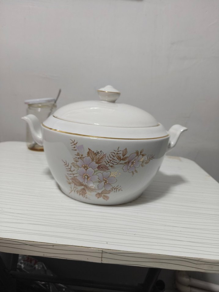 Pastel çiçek desenli, altın detaylı beyaz porselen kapaklı çorba tenceresi. çorba servisine uygun.