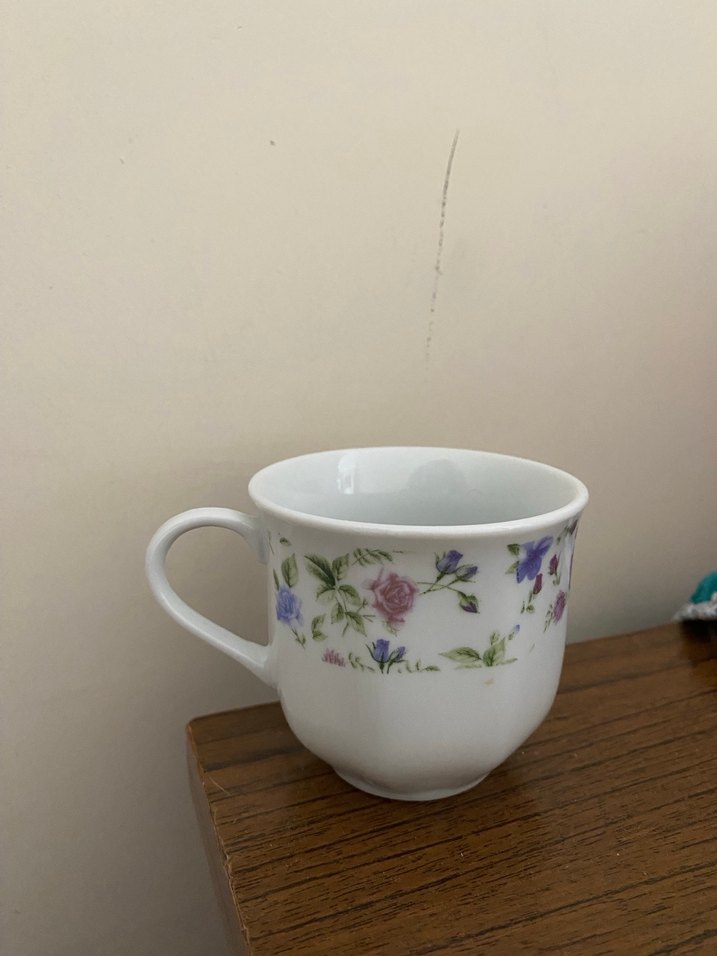 Beyaz porselen kupa, pastel çiçek desenleriyle çevrili ve rahat bir tutma sapına sahip.