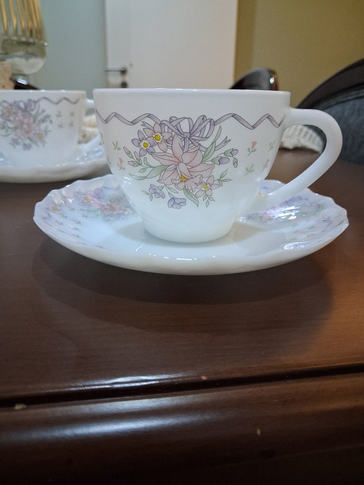 Pastel renklerde çiçek ve kurdele desenleriyle süslenmiş beyaz porselen fincan ve uyumlu tabak. 6 lı takım #vintage #çaytakımı #6lıporselençaytakımı