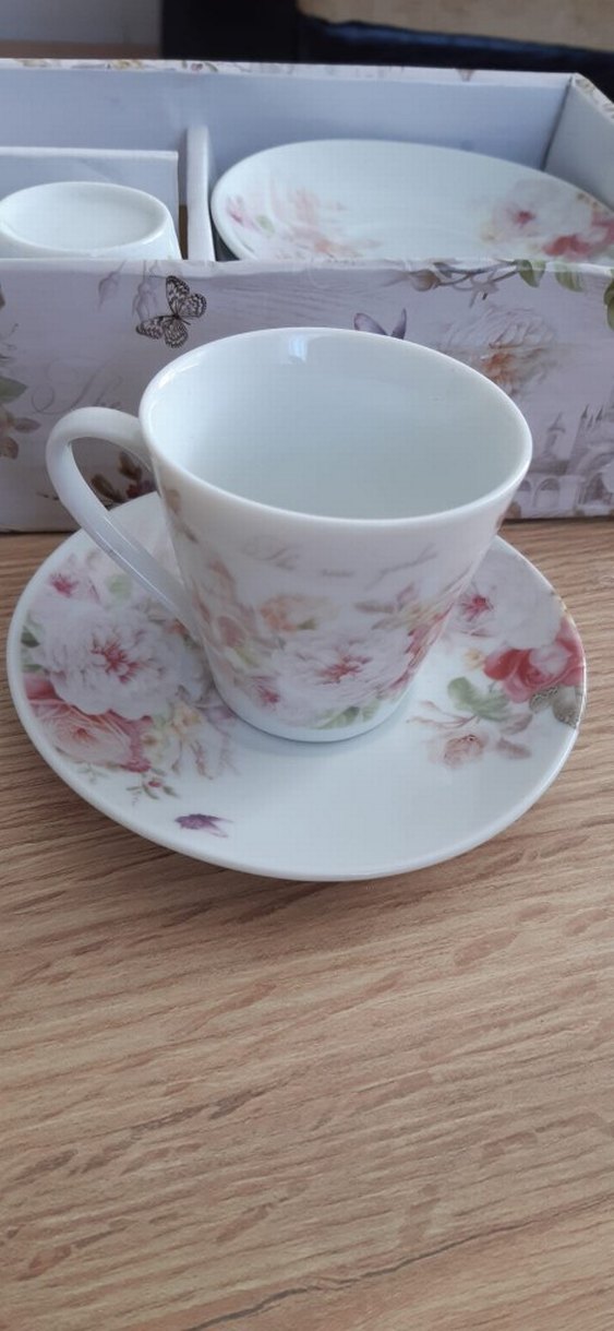 Beyaz porselen üzerine pastel renkli çiçek desenleri bulunan fincan ve tabağı, masanıza zarif bir dokunuş katar. ☕