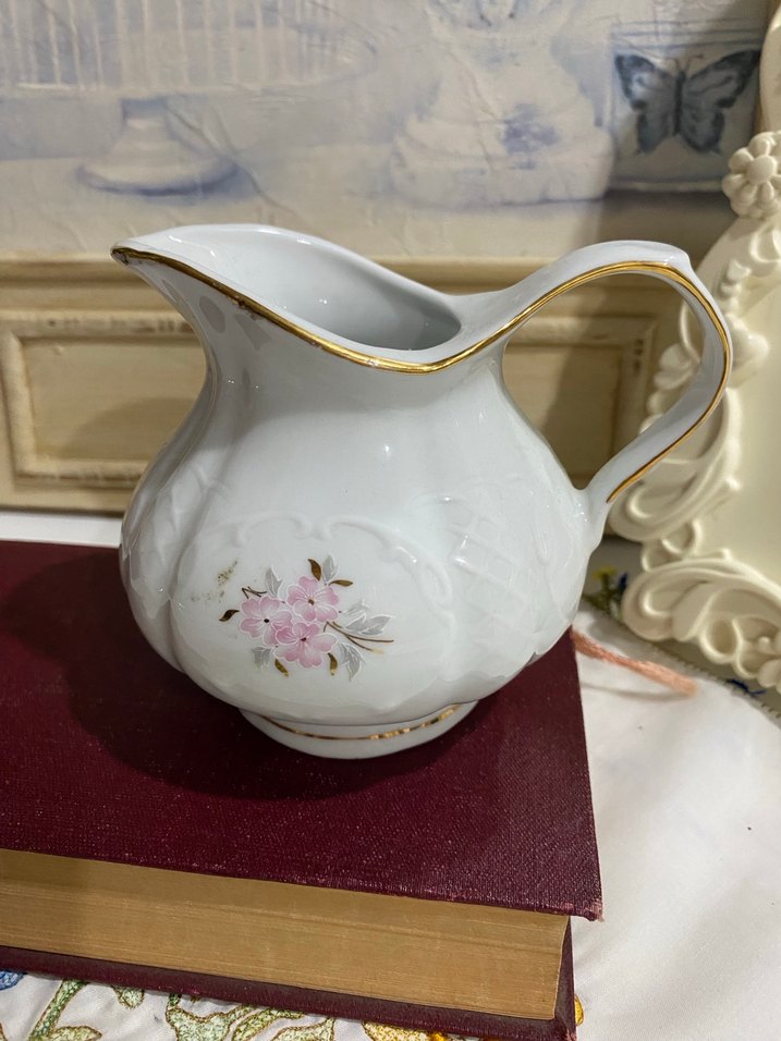 Pastel çiçek desenli, altın detaylı beyaz porselen sütluk Kavisli kulp ve döküm ağzı ile içecek servisi için uygundur.