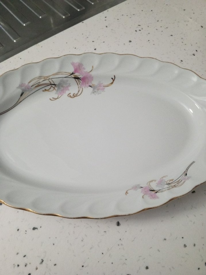Pastel çiçek desenleri ve altın detaylı kenarları olan beyaz porselen tabak. ️34 cm 23 cm
