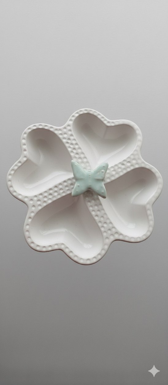 Beyaz servis tabağı, pastel çiçek desenleri ve çağdaş tasarımla dört kalp şeklinde bölmeli, ortasında dekoratif bir figür bulunur. ️